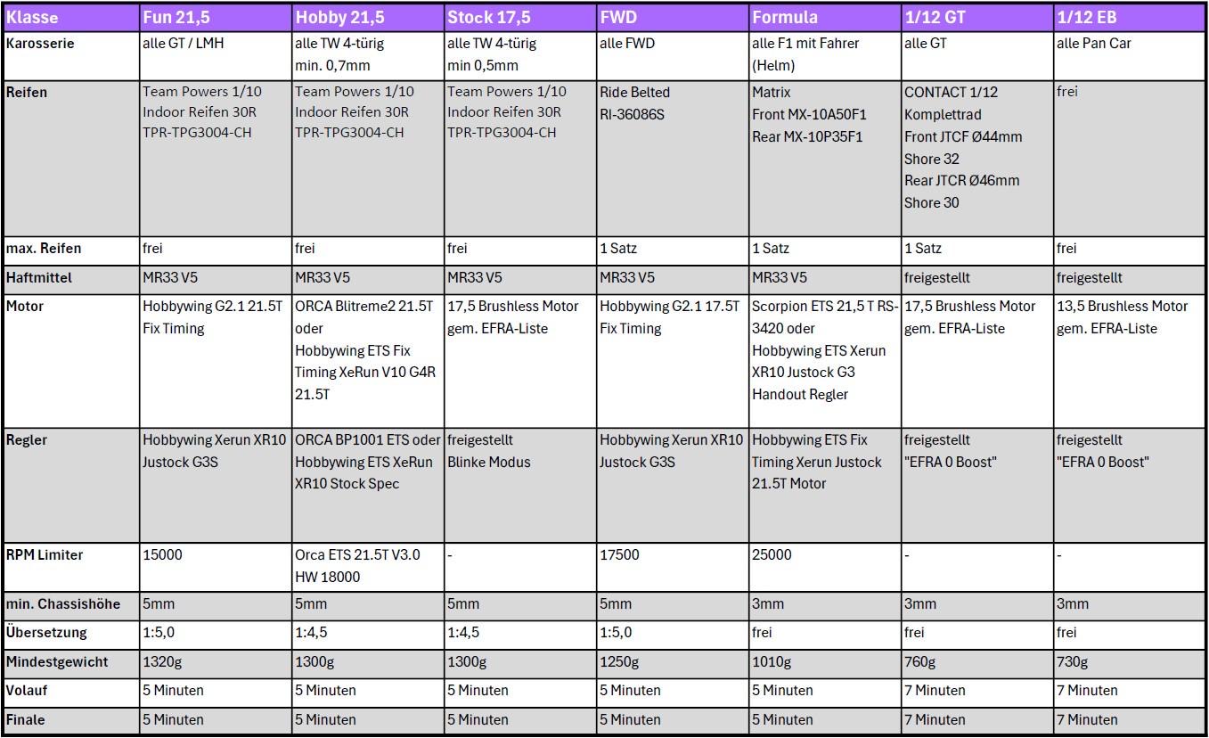 Bearbeitung: Die mechanische oder chemische Bearbeitung der Reifen für die 1/10 Klassen ist verboten. Lediglich das Entfernen des Mittelstegs mit einem geeigneten Werkzeug ist erlaubt. Das Schleifen der 1/12 Reifen ist zulässig.